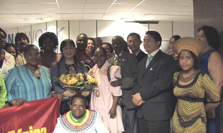 À l'aéroport du Johannesburg, Dr. LI était accueillie par le groupe de 50 distributeurs supérieurs et les membres de Green World en Afrique.
