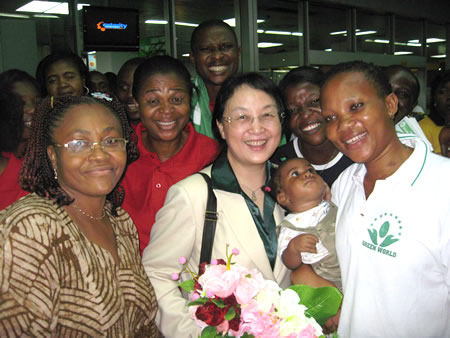 À 7 heures 35 de la nuit à l’heure locale du 27 mars 2009 à Nigeria, Dr. Deming LI, Présidente de Groupe Green World, Par la United Arab Emirates Airlines, est arrivée à l’aéroport MM de Lagos. Monsieur David Zhang, Vice-président de Green World et Président général de Green World Afrique, avec plus de 100 distributeurs de Green World sont arrivés à l’aéroport pour accueillir Dr. Deming LI.