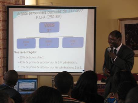 (1) Ce système abondant de ressource humaine : Monsieur Justin Kenang et Monsieur Obiora, deux leaders excellents du réseau, ont dizaine de conférenciers spécialisés sur les produits et le plan de marketing, après la formation systématisée, presque tous les membres peuvent présenter les produits sur la scène.