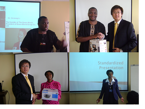 En plus, on a invité M.Daniel, maître-assistant kenyan et distributeur de huit étoiles du Green World et Mme Malter, maître-assistante du Green World L’Afrique du Sud à nous apporter des allocutions excellentes. A part des connaissances du produit et du système, on a mis aussi la formation sur la direction et la cohésion du groupe de réseau.