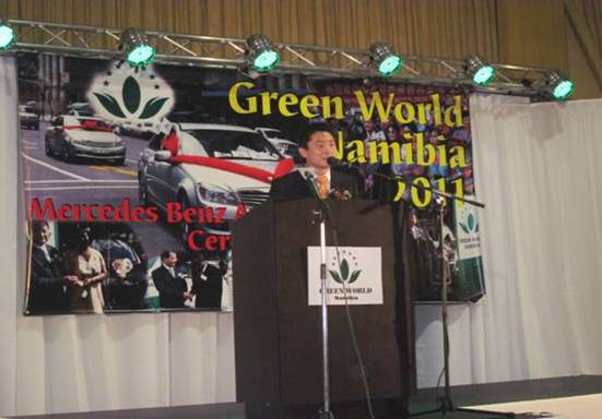 Parmi les principaux orateurs de la cérémonie de Prix de Voiture luxueuse, M. David L. Zhang, président de Green World Afrique, a prononcé un discours. Il a récapitulé les grandes réalisations qu’a obtenu Green World au cours des trois dernières années en Afrique. Il y avait des dizaines de filiales établies en Afrique et Green World a atténué le chômage avec le plan de marketing unique et a apporté des soins de santé à la population de l'Afrique. De plus en plus de gens rendent leur santé améliorée et réussissent de faire des affaires pour Green World. M. David L. Zhang a également annoncé la stratégie et le plan de Green World en Afrique dans la nouvelle année 2011. Green World continuera à promouvoir le marché africain et à fournir des produits de haute qualité et des opportunités d'affaires pour aider plus de gens partout dans le monde. M. David L. Zhang a aussi hautement apprécié la contribution apportée par les distributeurs de la Namibie et d'autres pays. Il a également exprimé sa gratitude à eux au nom de Mme. Deming Li, présidente de Green World pour les efforts qu'ils mettent dans l’entreprise de Green World qui est une cause sublime. Enfin, il a remercié la Première Dame Penehupifo Pohamba d’épargner le temps de son horaire chargé pour assister à cette Conférence de Prix de Voiture de Green World ce qui est apprécié comme une reconnaissance et un soutien du gouvernement namibien.