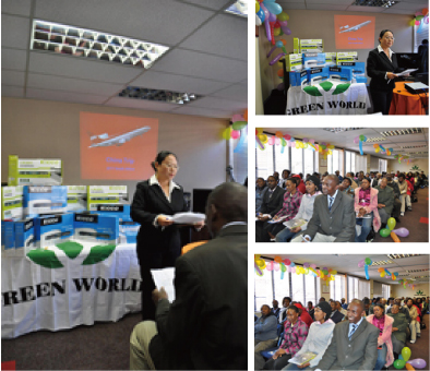 A 10h du matin, la cérémonie a commencé dans l'attente et les applaudissements de tous les distributeurs. D'abord, Mme Qian Wang, directeur général de Green World Johannesburg de l’Afrique du Sud et directeur du département de formation de la région africaine, a prononcé une allocution de bienvenue:Avec le soutien de tous les distributeurs, Green World l’Afrique du Sud, qui n’a pas reculé devant les dures épreuves, a déjà traversé quatre années. Nous avons assisté à beaucoup de miracles du Groupe Green World. De plus en plus de distributeurs ont non seulement amélioré leur état de santé, mais ont réalisé la liberté de richesseï¼› ils sont allés faire un voyage en Chine et ont obtenu le prix de voiture; Dans le monde de Green World, tous leurs rêves ont été réalisé. Avec la conviction "La santé prime tout, et être toujours honnête" dans l'esprit, Green World remercie le soutien et les efforts de tous les distributeurs, et va aider continuellement les distributeurs à obtenir un succès plus grand!