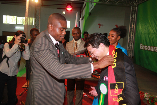 Le représentant de distributeur de Angola a donné le foulard national au président Zhang.