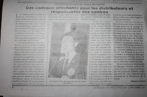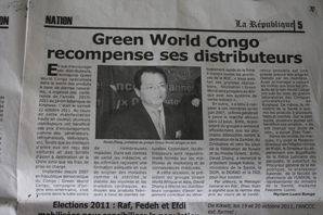 La filiale Congo-Kinshasa de groupe Green World a passé des processus de 4 ans avec vent et pluie depuis la fondation de la filiale à maintenant. A cette période, le groupe Green World a un soutien par la plupart de distributeurs de la région Congo-Kinshasa de groupe Green World et a une belle réputation de tous les gouvernements. Le 22 octobre 2011, la filiale Congo-Brazzaville a tenu une conférence d'encouragement de distributeurs en 2011. la conférence a tenu au parc de JARDIN BOTANIQUE DE KINSHASA près de la rue commerciale. A un jour spécial, le parc a réuni plus de distributeurs à moins de 8 heurs. Tous ont pris un costume d'apparat, et avec joie de la fête sur le visage.