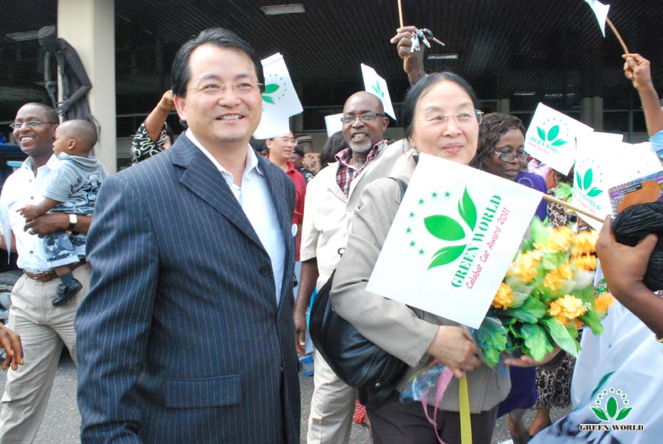 Le président Deming Li a sorti de l’aéroport avec accompagner de Monsieur David ZHANG, Vice-Président de Groupe Green World, Président de Green World Afrique et les représentants de distributeurs de calabar.