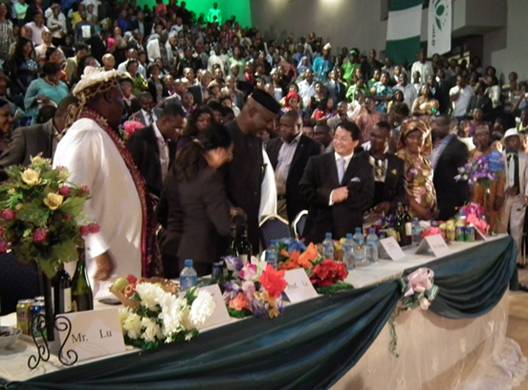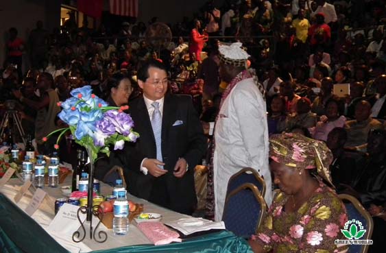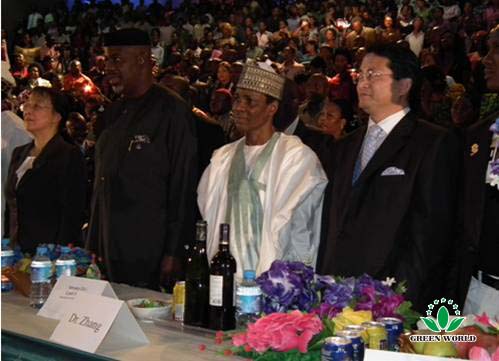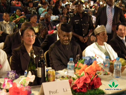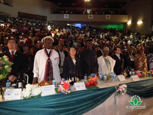 Le 19 novembre, 2011, la quatrième conférence de décerner le prix de la filiale nigérian de Groupe Green World a tien en CULTURE CENTRE, le centre de groupe conférence connue de la ville de CALABAR, la capitale de la région de CROSS RIVER STATE nigérian. Le président Deming Li de Groupe, Monsieur David ZHANG, Vice-Président de Groupe Green World, Président de Green World Afrique, mme Yuxue Zhang, le manager général de la filiale de Calabar, m Xiaoju Qiu, le manager général de la filiale de Abuja, M. Lizheng Jia, le manager général de Lagos et tous les employés de la filiale de Calabar nigérian. Senator (Dr) Liyel Imoke, le gouverneur de la région de CROSS RIVER, le vice-gouverneur de la région de CROSS RIVER, le parlementaire de parlement, directeur général de bureau de police, le roi local (the Obong of Calabar)et le président de association de chef de tribu de la région ont assisté la conférence magnifique. En plus, plus de 5000 distributeurs de venir de Nigeria, Ghana, Cote d'Ivoire, Cameroun, Gambie et Afrique du sud etc. ont pris les costumes d’apparat d’invité de participer la grande conférence.
