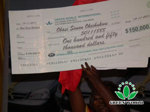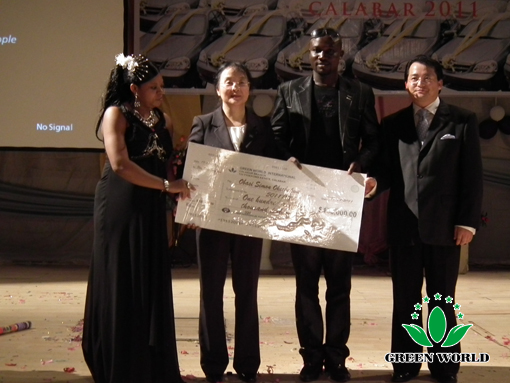 Quand monsieur OBASI SIMON a en train de sortir, après de gagné le prix de télévision d’écran LCD de 42 pouces anglais, le présentateur l’arrenté, et il a un autre prix de plus grande de l’arrêté en fait, il a gagné le prix de la villa ! Le président Li et le président Zhang ont le décerné le chèque de 150,000 dollars en personne. Le chèque de grand nombre a attiré les yeux de tous les hommes qu’il non seulement la nombre sur chèque de 150,000 dollars, et aussi la réussite et l’honneur de donner par GREEN WORLD.