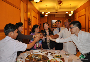 Président Li 、Président de la zone de l’Asie du Sud-Est ,directeur de la filiale de Green World XiaoYonghong et les excellents concessionnaires des Philippines et de l’Indonesie boivent ensemble