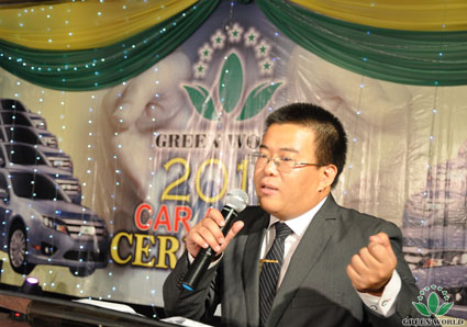 Suivant, président Zhang a prononcé un discours, président Zhang a tout d’abord remercié à tous les invités et tous les distributeurs, ensuite il a affirmé tous les efforts des distributeurs sur le développement de Green World Groupe, et a loué tous les distributeurs de Green World sur leur esprit de travail, enfin, il a partagé avec tout le monde le cours du développement de Green World, la situation actuelle et l’aménagement du développement futur et a souhaité que cette réunion pourrait prendre un grand succès. Les paroles de président Zhang ont gagné des applaudissements chaleureux.