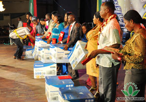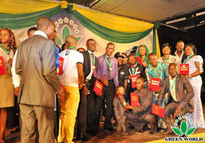 Dans les activités du décernement suivantes, prix de magasin spécialisé, prix de distributeur de niveau dèétoile, prix de voiture, prix de voiture de luxe, prime de villa ont gagné beaucoup d’applaudissements et d’acclamations et ceux qui ont poussé l’ambiance de cette réunion à l’apogée. Cette réunion a compris trois étages, prix de magasin spécialisé, prix de niveau d’étoile et prix spécial. Premier étage : 25 prix d’argent de magasin spécialisé, 18 prix d’or de magasin spécialisé, prix de diamand de magasin spécialisé, ils ont gagné KENWOOD pressoir , PANASONIC four à micro-ondes et LG42 téléviseur. Deuxième étage : il y a 74 distributeurs de 8 étoiles, ils ont respectivement gagné une médialle d’or, des distributeur de niveau de directeur et de directeur général ont respectivement gagné de différents niveaux de médailles en cristal, le prix le plus haut niveau est gagné par un boutiquier NO. 006 Mademoiselle. NGOZI . Troisixème étage : il y a 364 distributeurs gagnant le prix de voiture, 8 distributeurs gagnant le prix de voiture de luxe, 4 distributeurs gagnant la prime de villa coûtant 150000 dollars. Totalement plus de 400 distributeurs ont gagné le prix, tous ces prix ont élevé l’enthousiasme des distributeurs sur les affaires et les produits de Green World, ils ont chanté et dansé. Cette réunion est pleine de la joie et du bonheur.