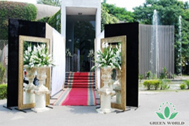 On a placé des lys blancs avec des feuilles vertes dans l’entrée, ce qui symbolise la cause longue de Green World