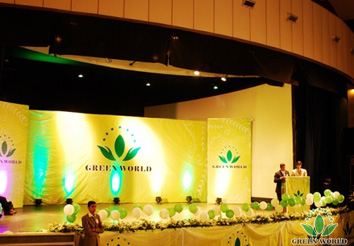 La scène et est flanqué d'un logo de Groupe Green World, elle est brillante e n particulier sous les lumières