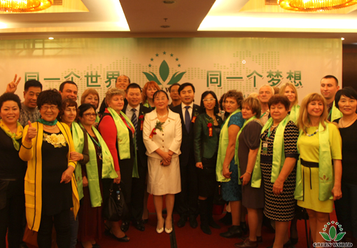 Présidente Deming Li, vice-président de Groupe Green World et président de zone d’Asie- Europe Monsieur Yanguo Chen, vice-président de Groupe Green World Chine Monsieur Yifan Wang et directrice de la filiale en Ukraine Madame Xiaohong Wang prennent la photo avec distributeurs excellents venant de Russie, du Tadjikistan,d'Ukraine, de l'Ouzbékistan et de Chine