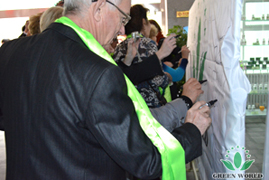 Distributeurs signent leurs noms sur le drapeau de Green World et écritent les meilleurs vœux pour Green World