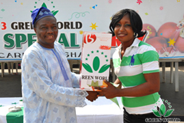 M. LZJia, directeur général dela filiale de Groupe GreenWorld à Lagos du Nigeria, présente les médailles et les coupes auxdistributeurs avec des performances exceptionnelles en 2013