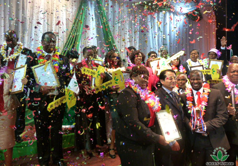 M.David L.Zhang, vice-président de Green World Group et président de Green Afrique,décerne le prix du voyage international et le prix de voiture commerciale auxlauréats et prend des photos de groupe avec les gagnants.