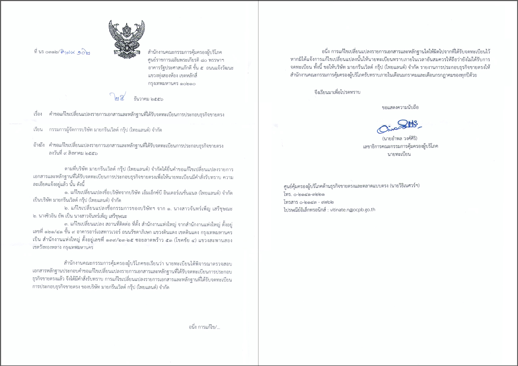 Licence devente directe de la filiale du Groupe Green World en Thaïlande délivrée parAssociation de vente directe thaïlandaise