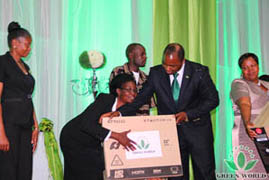 MmeNgidi Thembisile, distributrice de haut niveau de l’Afrique du Sud de Groupe GreenWorld, et M. Tendai Chinoperekwei, distributeur de haut niveau et conférencierinternational du Zimbabwe de Green World, présentent le prix de TV aux 5distributeurs 5 étoiles qui ont gagné la croissance rapide 5 étoiles