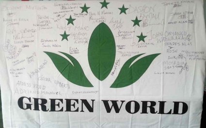 Distributeurs ont signé leurs noms sur le drapeau de Green World à exprimer le meilleur souhait de Green World