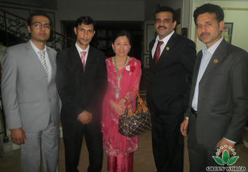 M. Ghani Khan (premier à droite), distributeur 6 étoiles de Green World, réalisateur du prix de nouveau star du Pakistan 2014, le propriétaire de Green World à Mardan, avec son parrain M. Waqar Ali, chef honoraire de 1 étoile de diamant de Green World (deuxième à droite), et Mme Louisa Liu, directrice générale de la filiale au Pakistan (au centre) et les membres de son équipe