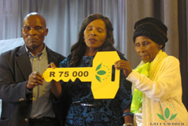 Le distributeur de haut niveau Mme MGOLODO (au milieu) a présenté R5000 de chèque de la banque et un iPhone à deux lauréats du prix de voiture pour la stimulation et des félicitations