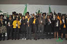 Mme Ngidi THEMBI, manager trois étoiles a présenté le trophée au manager One-étoiles récemment qualifié Mme CIMILANGA VIRGINIA KGOTLELE pour féliciter sa participation au titre honorifique