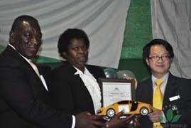 M. Glory Guo, directeur général de la filiale de Green World à Johannesburg de l’Afrique du Sud a décerné le prix de voiture commerciale à Mme Msibi, la nouvelle chef de l'équipe du Swaziland