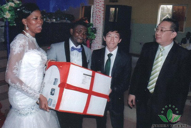 Tant la mariée et le marié sont d'excellents distributeurs de Green World qui ont trouvé leur amour éternel dans Green World. Lors de la cérémonie de mariage joyeuse, M. Shang, le directeur adjoint de la filiale de Green World à Lagos du Nigeria a présenté un cadeau spécial de mariage pour la mariée et le marié qui souhaitaient le couple avoir un mariage heureux et béni à la vie harmonieuse.