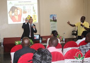 La conférence a été débutée par un discours de motivation du Dr Mbuya en provenance de la ville Arusha, gagnant du prix de voiture de Green World. Dr Mbuya a partagé ses expériences précieuses dans le développement de Green World, en attendant, il a mentionné qu'il a déjà reçu plus d'un prix de voiture pendant le temps au sein de Green World. Dr Mbuya a apporté une excitation et une motivation pour tous les participants.