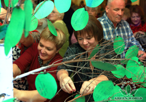 Les distributeurs ont mis les feuilles vertes portant leurs bons voeux vers Green World dans l'arbre de souhaits