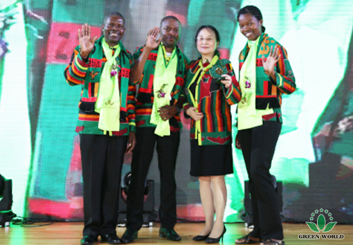 Les distributeurs de la région africaine, présentant leur cadeau, un sac à main spécial de Green World à Dr Deming Li