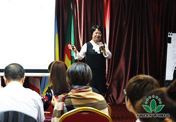 Mme Rannie Wang , vice-présidente exécutive de Green World Institut International de Commerce explique les connaissances du produit clé de Green World